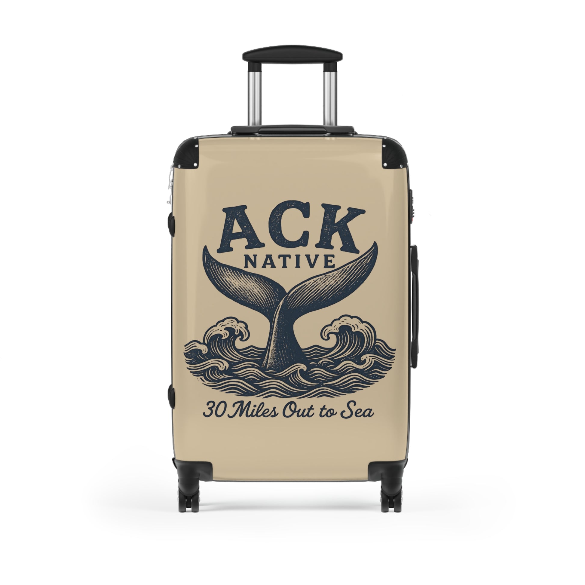 This premium ACK Native suitcase isn’t just luggage — it’s a moving tribute to island heritage, coastal pride, and the call of the sea. Featuring a bold whale tail cutting through ocean waves and the words “30 Miles Out to Sea,” it’s the perfect match for those who live life with salt in their veins and adventure on their mind.